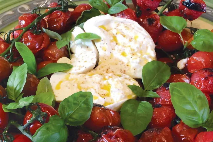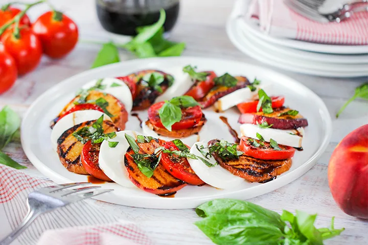 Caprese Salad with Grilled Peaches Save Print Caprese Salad with Grilled Peaches Author: How to Feed a Loon Yields: 6 Ingredients 6 Sinfully Sweet Campari Tomatoes® cut into...