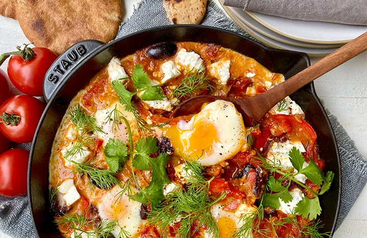 Shakshuka with Peppers, Feta, and Olives Save Print Shakshuka with Peppers, Feta, and Olives Author: Susan Spungen Yields: 4 Ingredients 1 lb. package Sinfully Sweet Campari tomatoes, cut into...