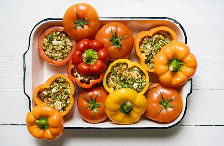 Gemista (Stuffed Tomatoes & Peppers) Save Print Gemista (Greek stuffed tomatoes and peppers) Yields: 4 Ingredients 4 juicy beefsteak® tomatoes 4 sweet bells® peppers 2 large russet...