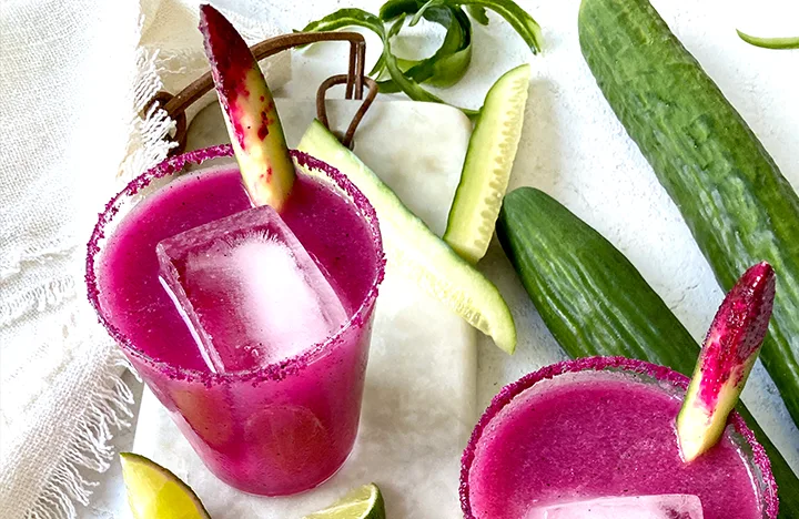 Cucumber Dragon Fruit Margarita Save Print Cucumber Dragon Fruit Margarita Author: Susan Spungen Yields: 4 Drinks Ingredients ½ Village Farms Luscious Seedless Long English® cucumber. peeled...